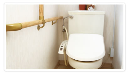 手すり付きのおトイレです。一人では困難な方でも手引き誘導などによる歩行等でおトイレに行っていただくことでADLの低下を防ぎます。